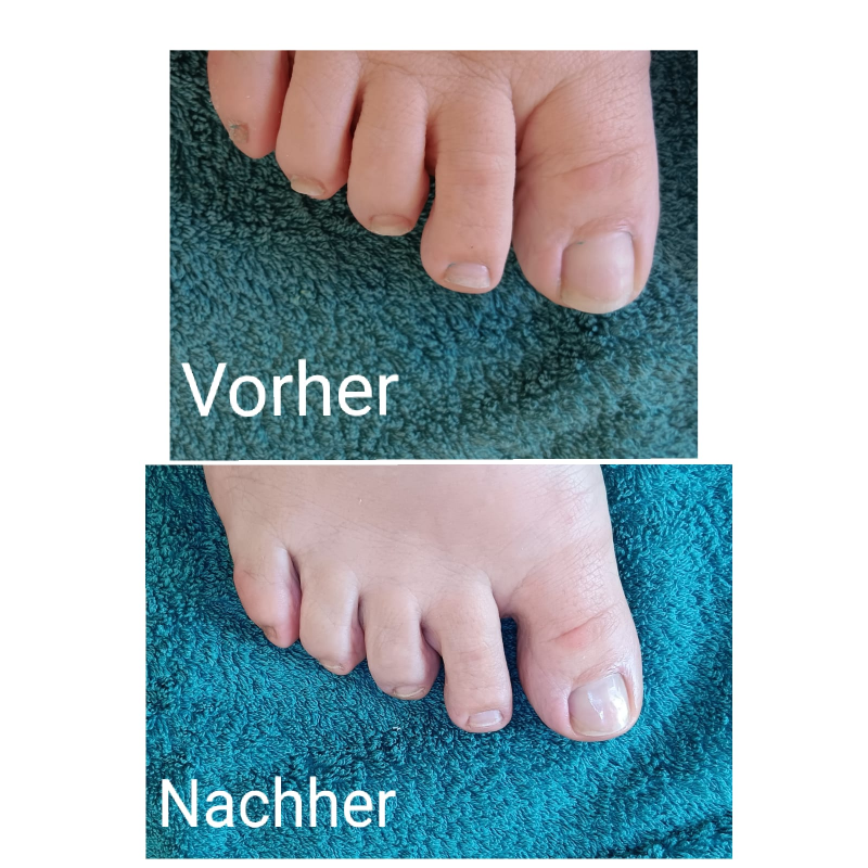 Eine klassische Pediküre-Verwandlung: Zunächst zeigen sich die Zehennägel ungepflegt, mit unregelmäßiger Form und beschädigter Nagelstruktur. Nach der Behandlung wirken die Nägel deutlich sauberer, glatt gefeilt, harmonisch gekürzt und mit einem dezenten UV-Striplack versiegelt – für ein frisches und gepflegtes Erscheinungsbild.