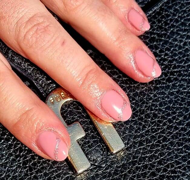 Die Nägel haben eine zarte, milchig-rosafarbene Grundfarbe, die mit einem schimmernden UV-Striplack erzielt wurde. Zwei Nägel pro Hand sind mit Glitzerakzenten versehen – einer komplett in funkelndem Goldglitter, der andere mit zarten Glitzerpartikeln auf dem roséfarbenen Untergrund.