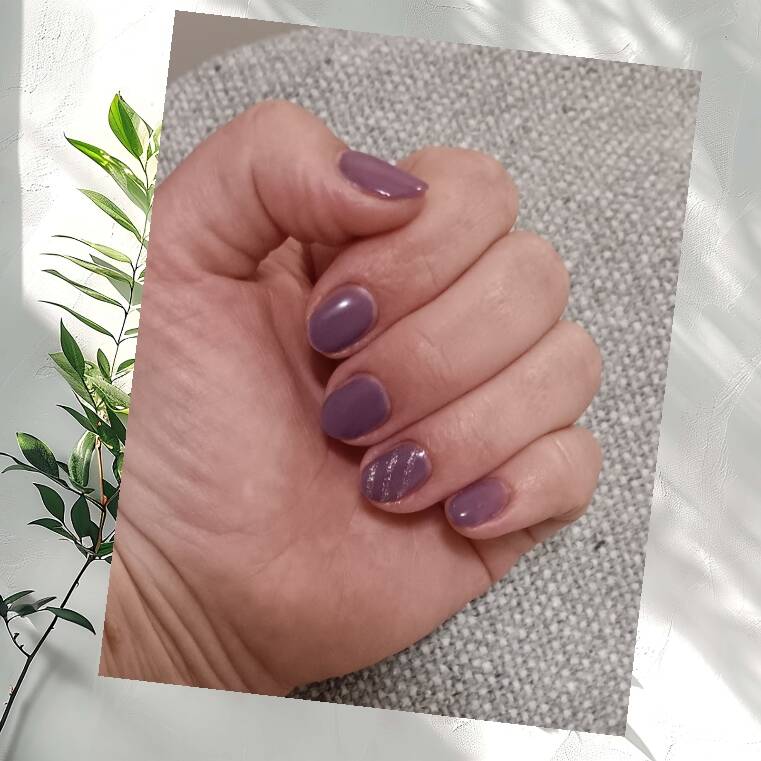 Hier sind die Nägel mit einem violetten UV-Striplack lackiert. Einer der Nägel hat ein dezentes Glitzermuster, das dem Look eine besondere Note verleiht. Der Glanz und die intensive Farbe des Striplacks wirken modern und elegant.