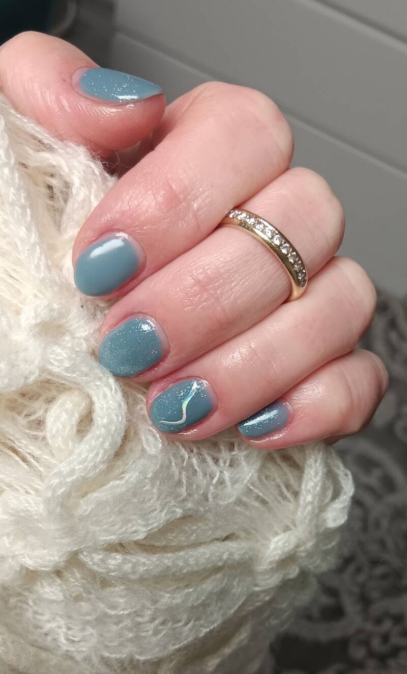 Здесь ногти покрыты бирюзово-голубым UV-Striplack. Два ногтя украшены блестками и изящными линиями, что придает дизайну креативность и индивидуальность. UV-Striplack обеспечивает насыщенный цвет и стойкий глянец.